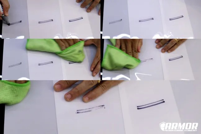 คุณสมบัติของชั้น Top Coat ของฟิล์มใสกันรอย จะมีความหนาประมาณ 15 ไมครอน ดังนั้น เมื่อเห็นคุณสมบัติเทพๆเหล่านี้ ไม่ได้หมายความว่าเราจะตะบี้ตะบันเอาแปรงทองเหลืองมาขูดทุกวัน แล้วมันจะอยู่ทนถาวรตลอดไป เพราะมันก็มีชั้นปกป้องของมัน